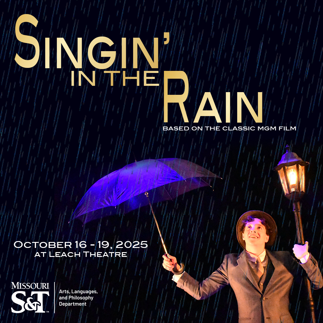 This rainy day has us looking forward to October when the Missouri S&T Theatre program will produce Singin' in the Rain on Leach Stage. Based on the classic MGM film, each unforgettable scene, song and dance is accounted for, including the show-stopping title number, complete with an onstage rainstorm! Hilarious situations, snappy dialogue and a hit-parade score of Hollywood standards make Singin' in the Rain the perfect entertainment for any fan of the golden age of movie musicals. October 16 - 19, 2025. We'll see you for more rain in the Fall!